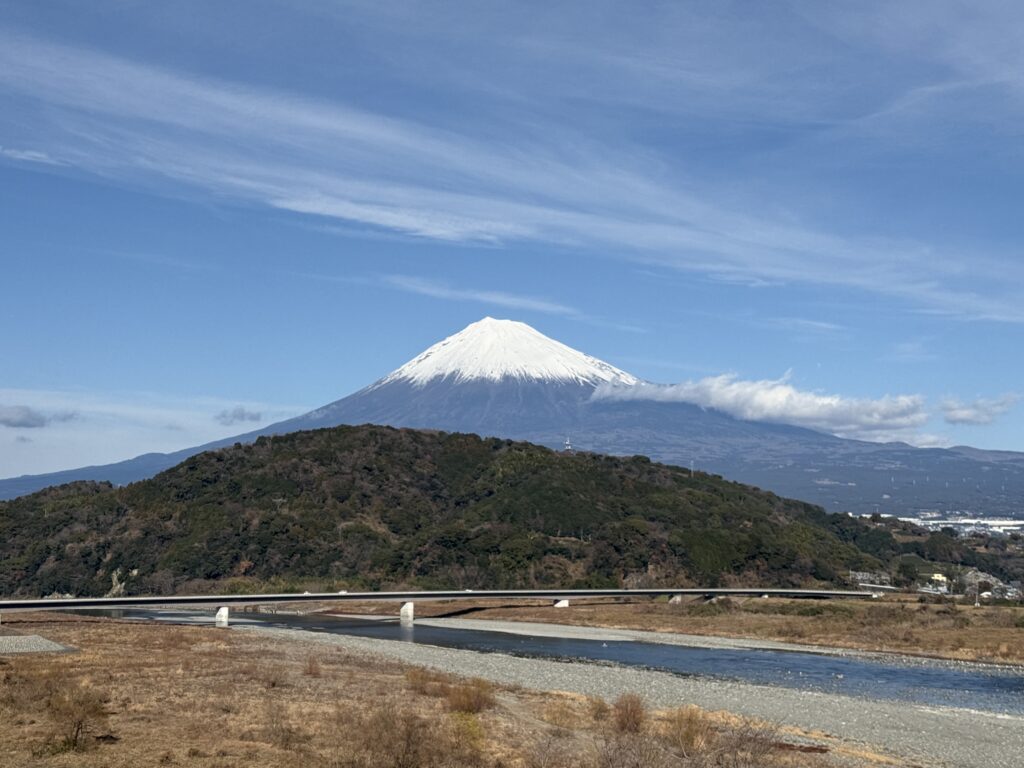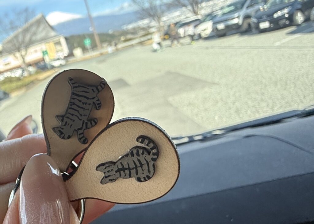 富士川SAでは、富士山の絶景とともに、イーちゃんそっくりのキジトラ猫キーホルダーをゲット!