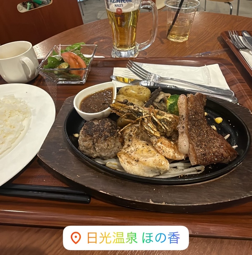 夕食は、ほの香の敷地内にあるレストラン「ザ・グリーンテラス日光」でステーキを。 作戦会議の結果、今夜の宿はまさかの標高が高い「戦場ヶ原・三本松園地駐車場」に決定!いろは坂の途中から楽天モバイルは安定の「圏外」に😂