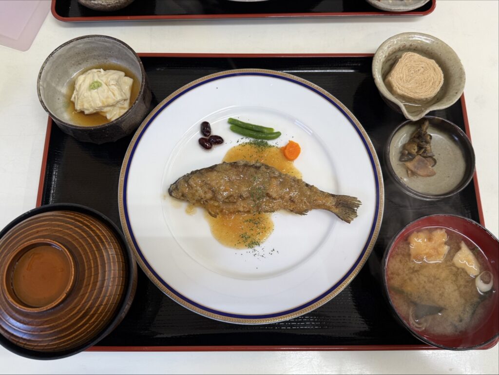 朝食は「レストラン日光」へ。ここで食べた「ニジマスの唐揚げ定食(湯葉付きをチョイス)」が、オレンジソースがかかっていて高級フレンチのようなお味で感動!意外な組み合わせだけど、これが本当に絶品!柔らかくて頭から尻尾まで骨ごとペロリでした。